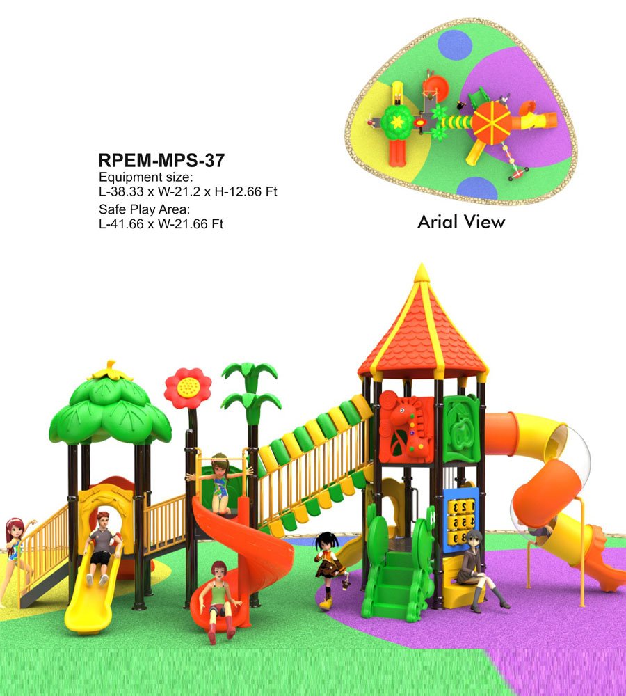 Multi Play Station is a jungle and fantasy-themed outdoor playground for kids aged 4-14, featuring slides, climbing bridge, and activity panels, made with durable, UV-protected materials.