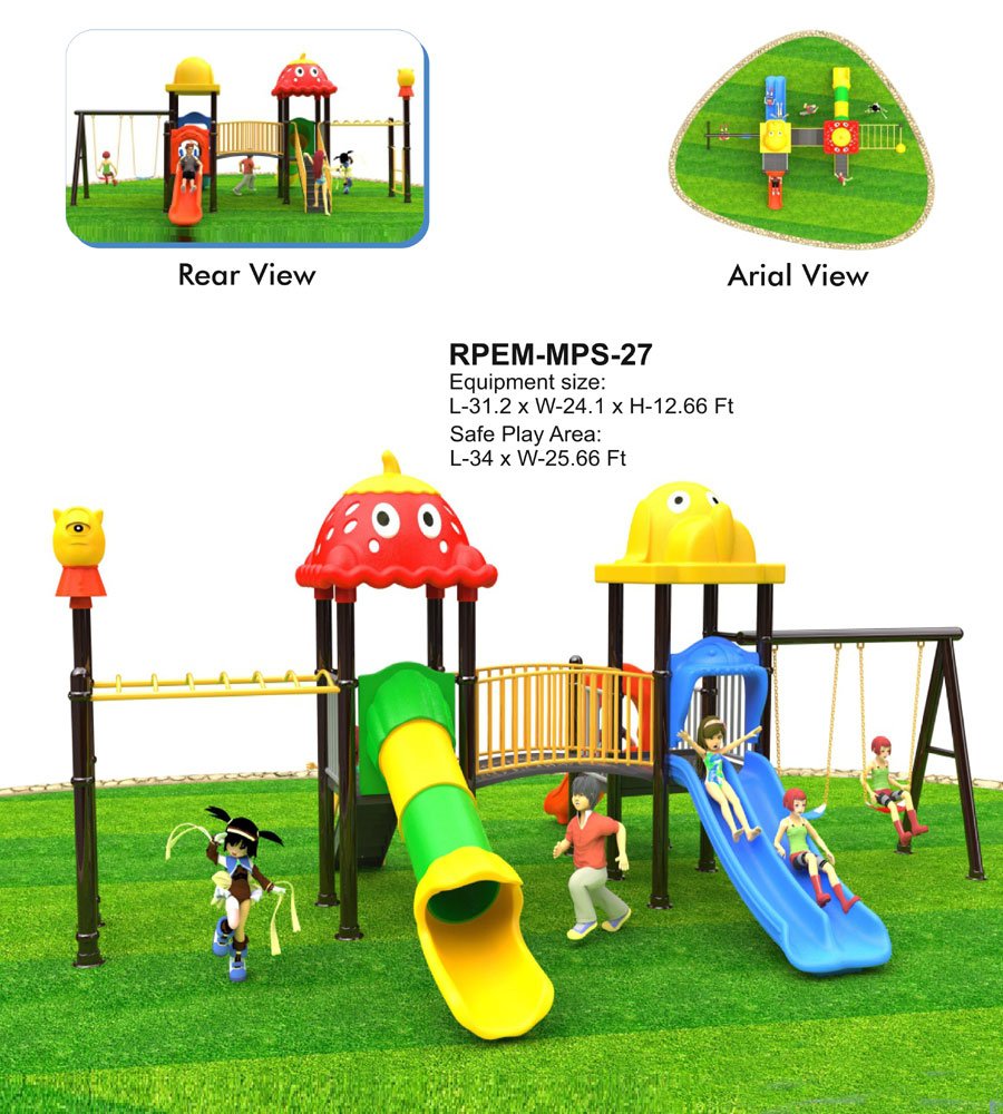 Made from heavy-duty materials such as powder-coated steel, FRP platforms, and UV-protected roto-molded plastic, this play station is built to withstand the elements and heavy use. Suitable for children aged 3-12 years, it can accommodate 16-22 kids at a time, making it perfect for schools, parks, and playgrounds with a safe play area of L-34 ft Ă— W-25.66 ft.