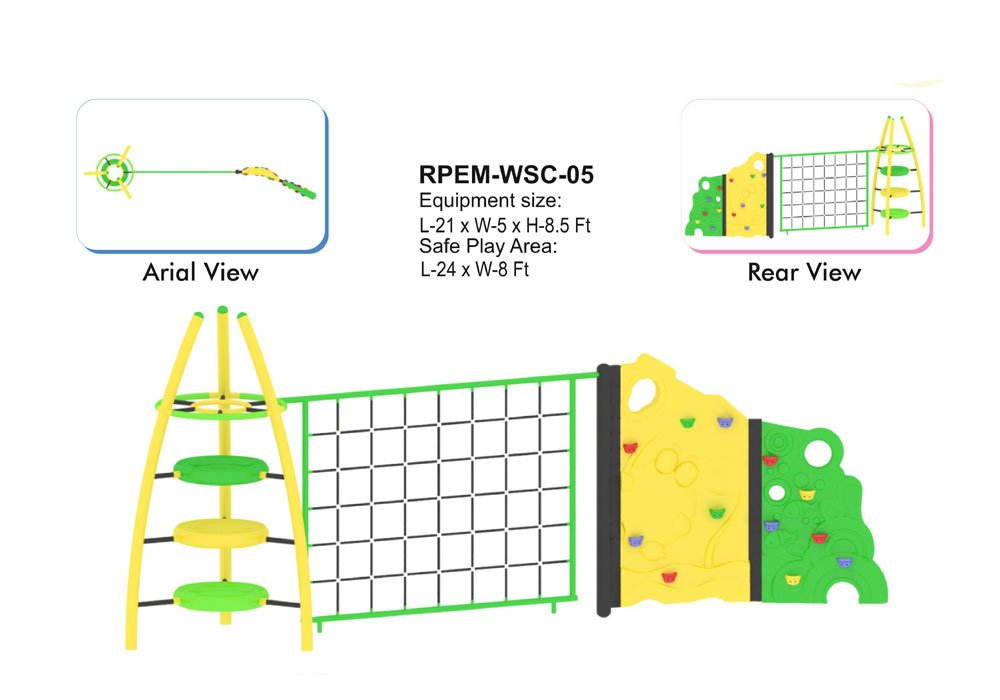 The Web Scramblers is constructed from durable materials, including powder-coated mild steel, FRP panels, and high-strength ropes. With a capacity to accommodate 12-15 children, this play structure is perfect for schools, parks, and recreational areas. The combination of a rope climbing net, circular step climbers, rock climbing wall, and adventure tunnel wall provides a thrilling experience for kids, making it an ideal addition to any playground.